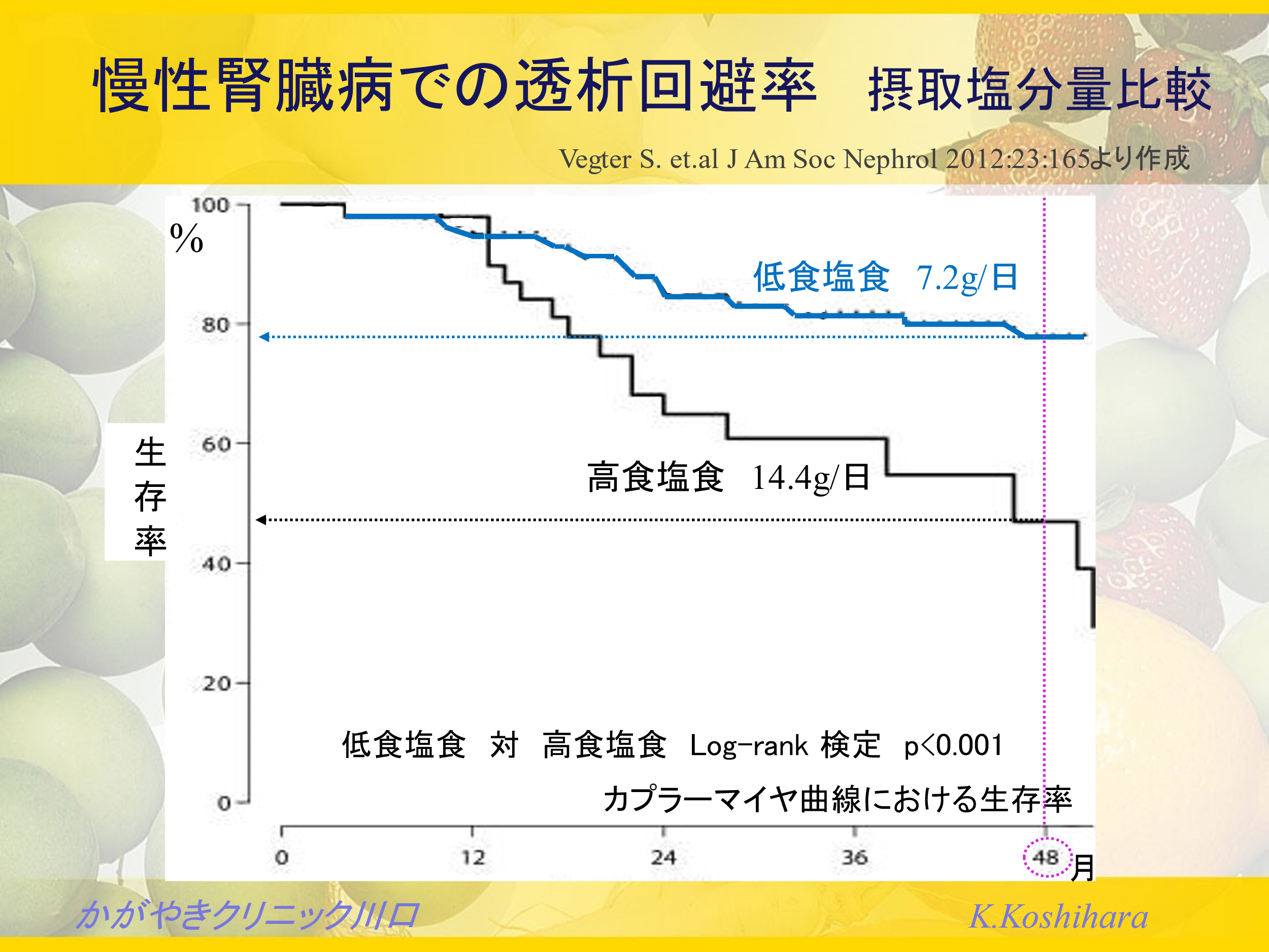 慢性腎臓病における透析回避率を高食塩と低食塩摂取者で比較した場合、あきらかな差が生じています。慢性腎臓病において4年(48ヶ月)間の観察において、高食塩食では透析回避ができたのは、50%を明らかに下回っていますが、低食塩食では80%弱と多く回避できています。