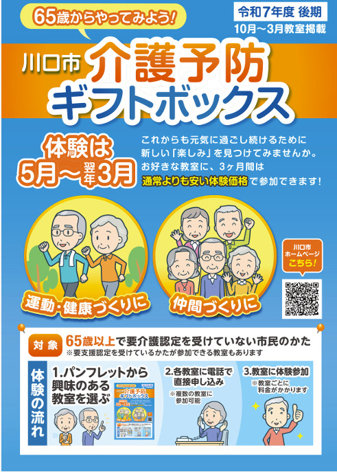 - 川口市の介護予防ギフトボックスでは、市内で活動している【運動】【健康づくり】【仲間づくり】などの様々な教室を紹介しています。元気に過ごし続けるために新しい「楽しみ」を見つけてみませんか。