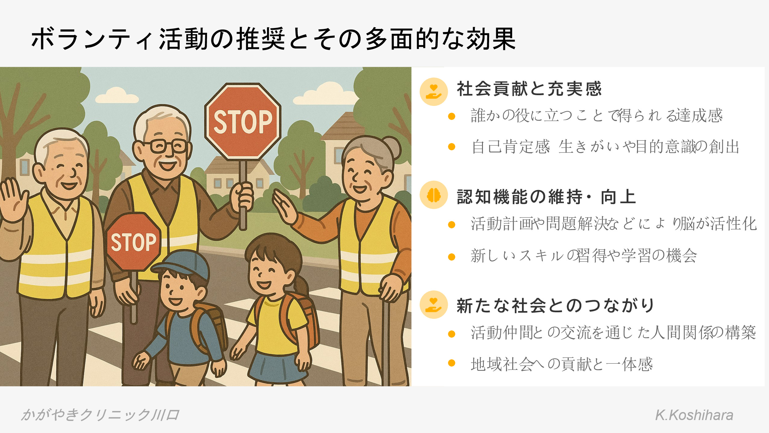 - 地域活動やボランティア活動に参加しましょう。社会的なつながりは自身の生きがいを高め、それは脳の機能向上に貢献します。