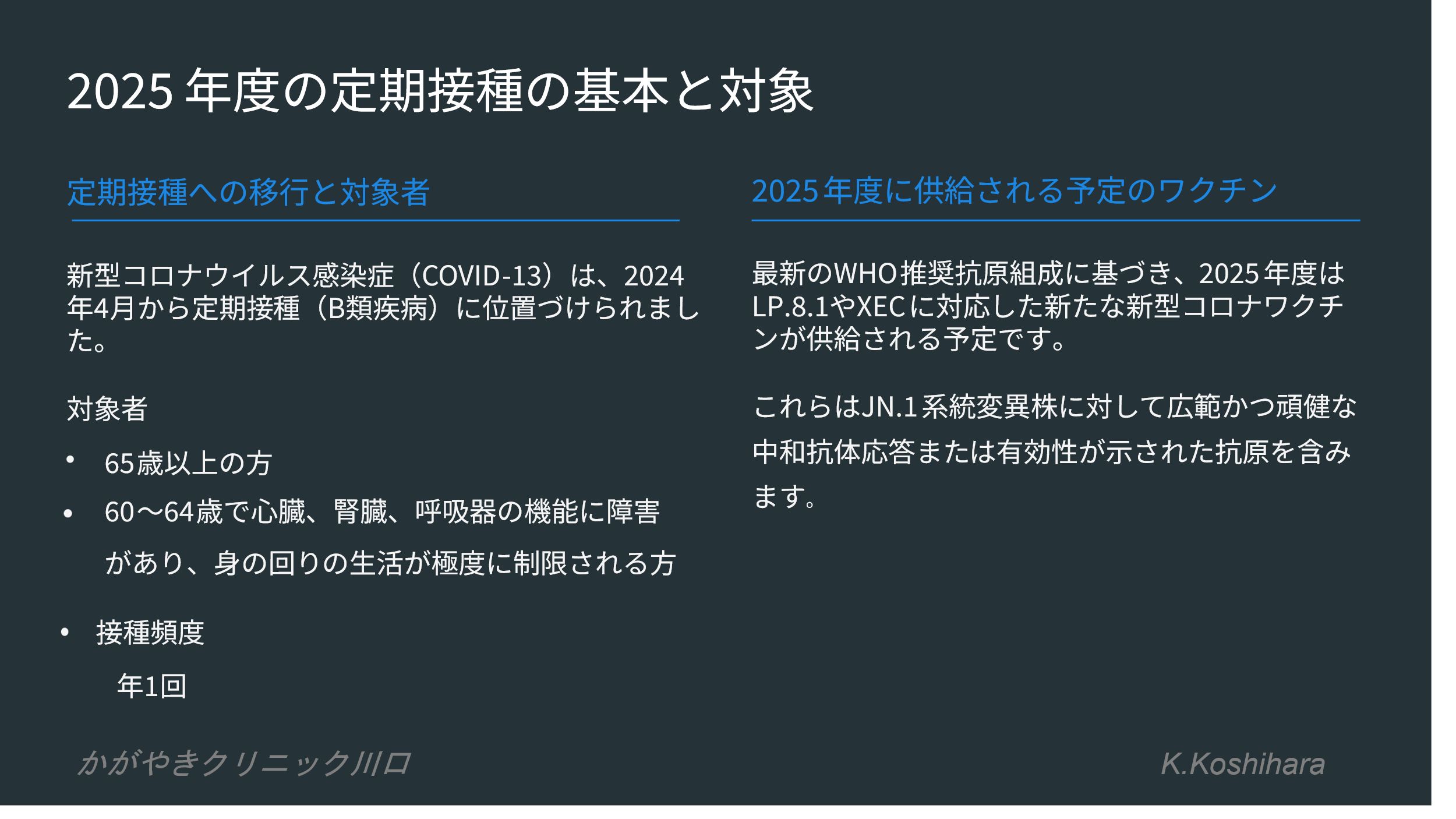2025年10月より、新型コロナウイルスワクチンの定期接種が全国で開始されます。当院では、皆さまの健康と地域の安心を守るため、最新の流行株に対応した新型コロナワクチンの接種を推奨しております。特に重症化リスクの高い高齢者の方や基礎疾患をお持ちの方は、インフルエンザワクチンと同様に、毎年の接種をご検討ください。