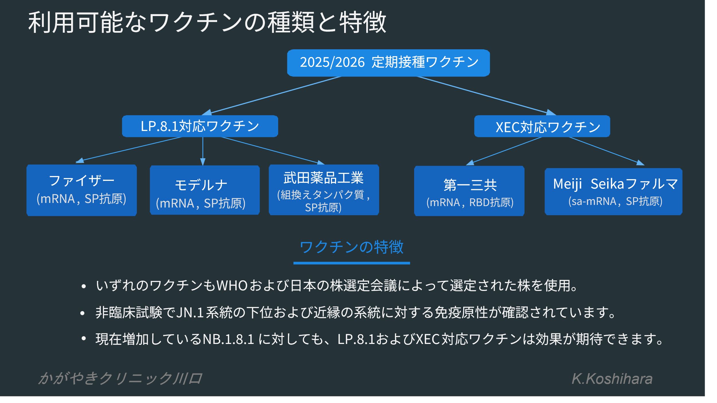 2025年度の定期接種では、オミクロンJN.1系統の「LP.8.1」および「XEC」に対応したワクチンが供給されます。これらのワクチンは、世界保健機関(WHO)および日本の株選定会議によって選定された最新の株を使用しており、非臨床試験でJN.1系統の下位および近縁の系統に対する免疫原性が確認されています。