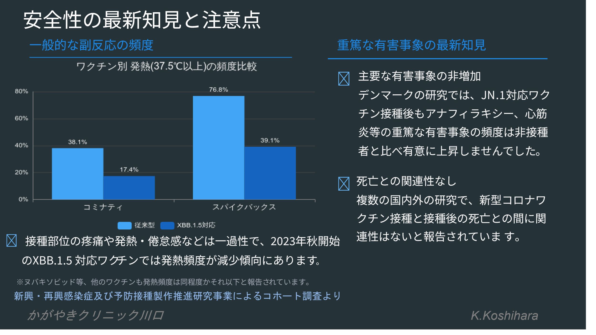 接種にともなう副反応は起こることは避けられません。ただしワクチンとの関連性が科学的に証明された重篤な事象はなく、誤った解釈が聞かれることがあります。この度の接種の勧めは、「2025年度の新型コロナワクチン定期接種に関する見解」日本感染症学会・日本呼吸器学会・日本ワクチン学会が、2025年9月1日に発表したCOVID-19流行期間中に学会等で報告されてきた科学的根拠に基づくものになります。