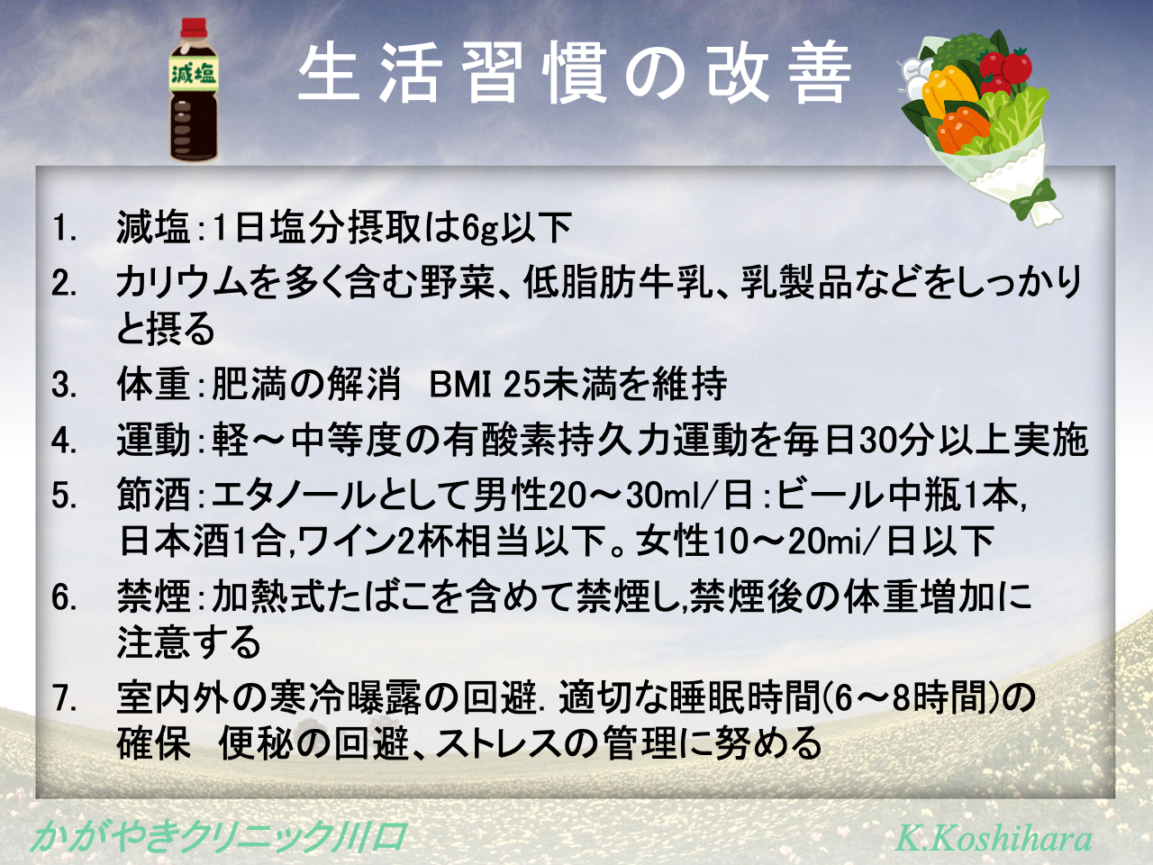 生活習慣の改善は、高血圧予防や降圧薬開始前のみならず、降圧薬開始後も持続することが重要です。